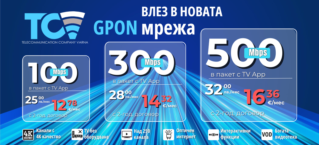 Доверете се на TCV и се възползвайте от нашите предложения за високоскоростен оптичен интернет и телевизия с кристално качество, над 250 канала и богата видеотека.